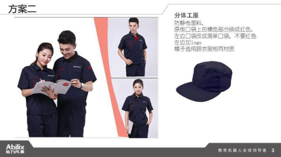 這兩款是我們公司幫他們設計的方案,結(jié)果一致通過并最終達成交易。鷹諾達板式新穎、簡約大方、配色充滿時尚感。布料采用高檔全棉、棉滌面料,舒適不起球不掉色,堅固可靠穿著舒適。此次他們公司采購的這批工作服是防靜電滌棉紗卡布料制成的,包括帽子同樣防靜電。目前這批工作服已在打樣生產(chǎn)。