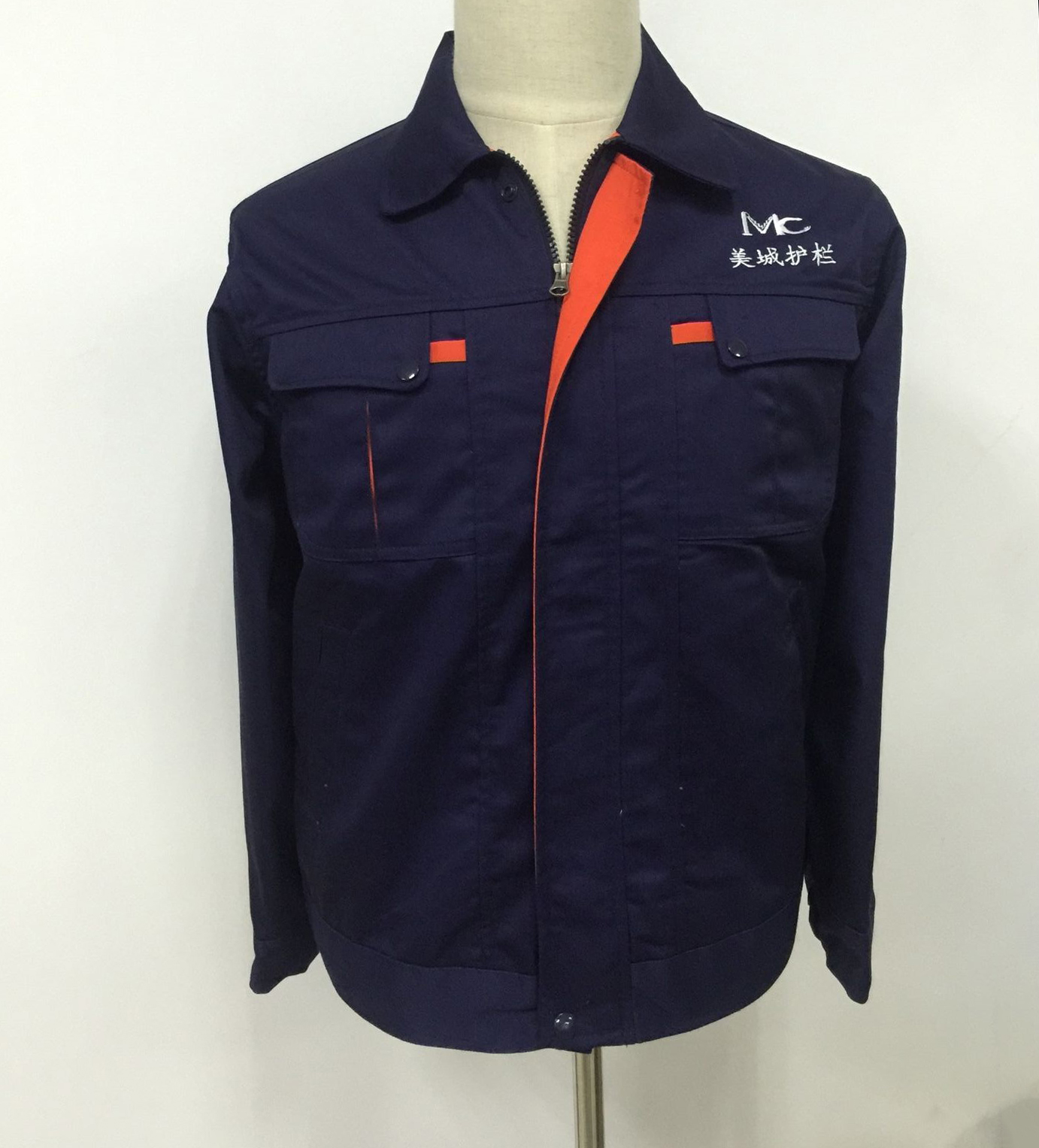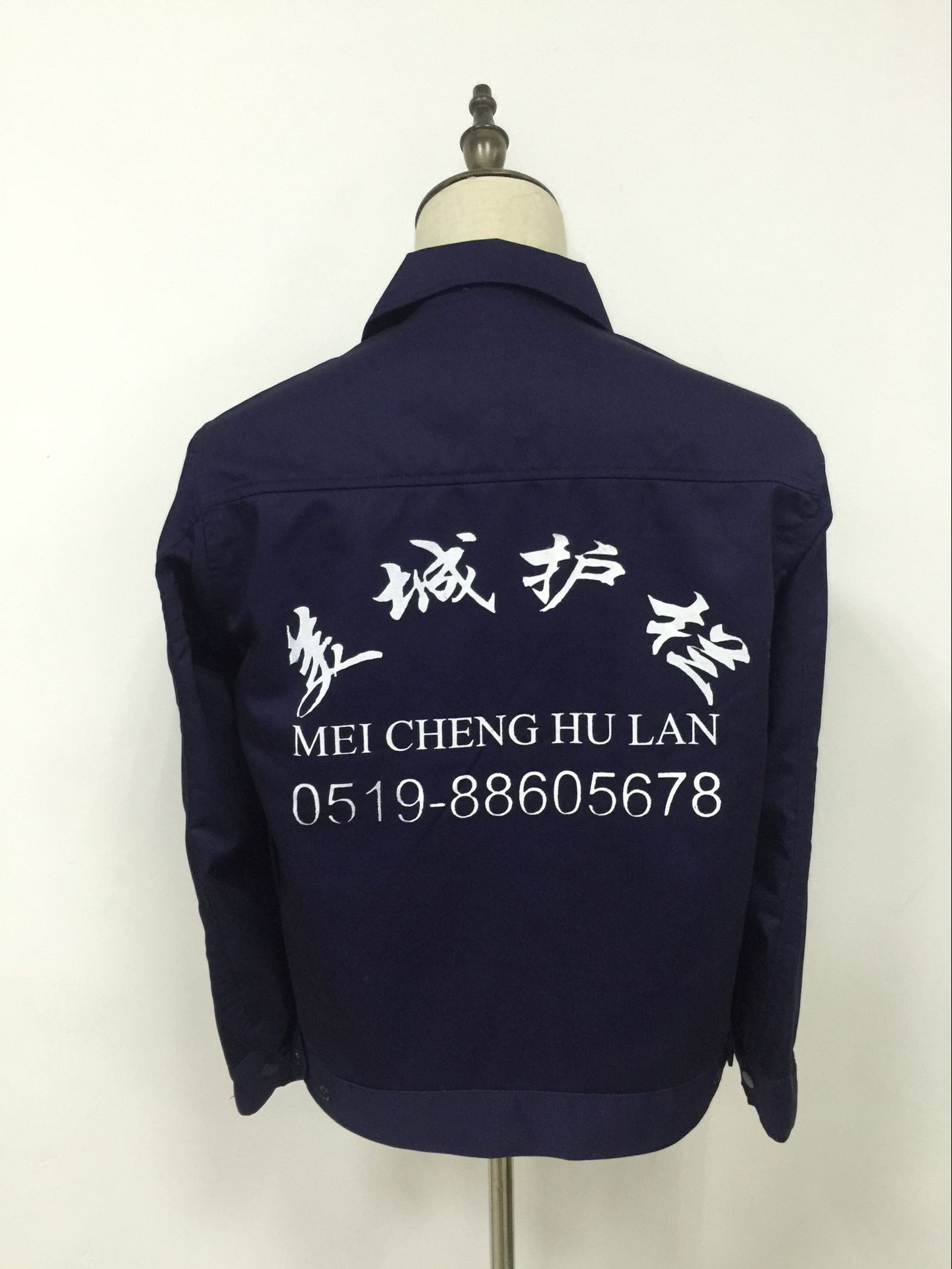 常州美城交通設施定制的春季工作服是采用我司的現(xiàn)貨AC069款,顏色以深色藏青色為主,左前胸刺繡上公司的LOGO和名稱,后背印上公司名稱和電話。因為其工作服人員長期在外安裝施工,所以后背印制電話也可以起到一個很好的宣傳作用。