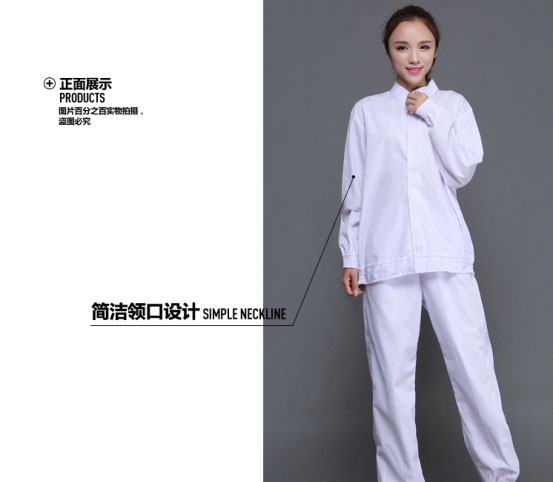 生區(qū)工作服潔凈要去相對較低,一般會(huì)選用白色食品分體套裝,衣服的袖口領(lǐng)口處都是收緊的??钍揭蠓浅:唵危瑹o口袋即可。面料多數(shù)為高棉或者專用醫(yī)護(hù)潔凈高棉面料。目前很多食品單位定制的就是這種白色食品服。