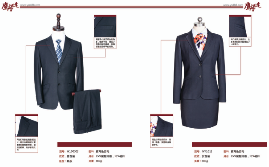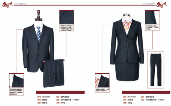 男辦公人員和女辦公人員的西服定制采用的是同系列的,采用的版型是韓版的西裝。女士收腰設(shè)計,男士每個人的配置是2套西裝+2件短袖襯衫+2件長袖襯衫。女士的則是采用的2件西裝上衣+1條褲子+1條西裙,襯衫長短袖各2件。材質(zhì)采用的是藏青色的仿毛。襯衫采用的是淺藍色的高端的襯衫。