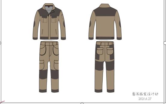 此款設(shè)計(jì)是咖色和咸菜色相搭配,衣服多立體口袋,在膝蓋和屁股處都有加固設(shè)計(jì)。