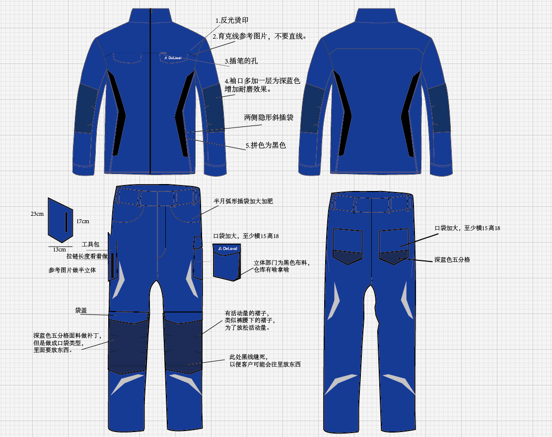 這個款式是寶藍(lán)色和藏青色相互搭配,在腰部處閃電線縫制設(shè)計(jì),膝蓋和肘部均有加固設(shè)計(jì),褲子上也多處采用不規(guī)則反光條,同樣口袋也是多口袋的設(shè)計(jì)