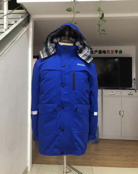如果您覺的冬季的需要加長款的也是可以定做的,案例2是中長款的羽絨工作服,可以護膝,在加上帽子全棉防御寒冷