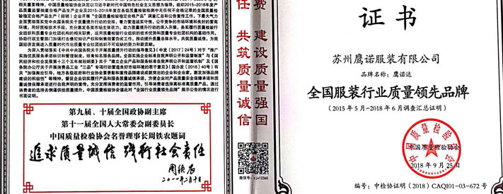 【喜報(bào)】鷹諾達(dá)榮獲全國(guó)服裝行業(yè)質(zhì)量領(lǐng)先品牌
